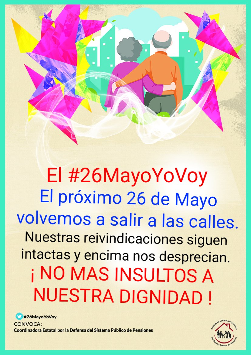 El próximo 26 de mayo las calles y plazas de centenares de ciudades y pueblos del Estado Español volverán a llenarse de manifestantes exigiendo pensiones públicas dignas, convocados por las Mareas, Plataformas y Colectivos agrupados en la Coordinadora Estatal por la Defensa del Sistema Público de Pensiones.